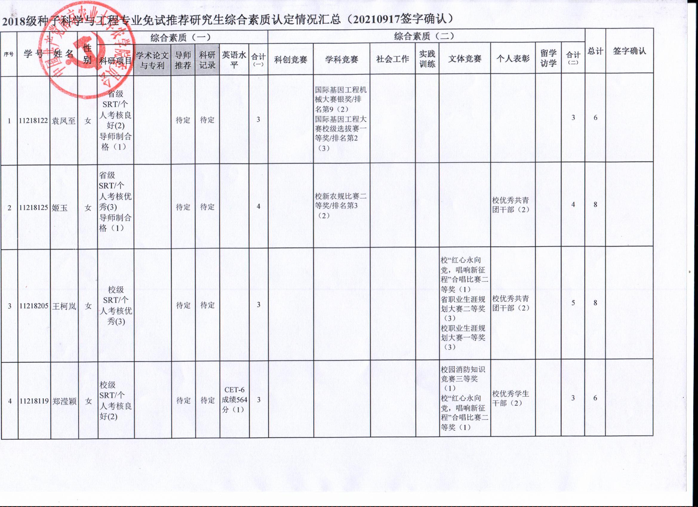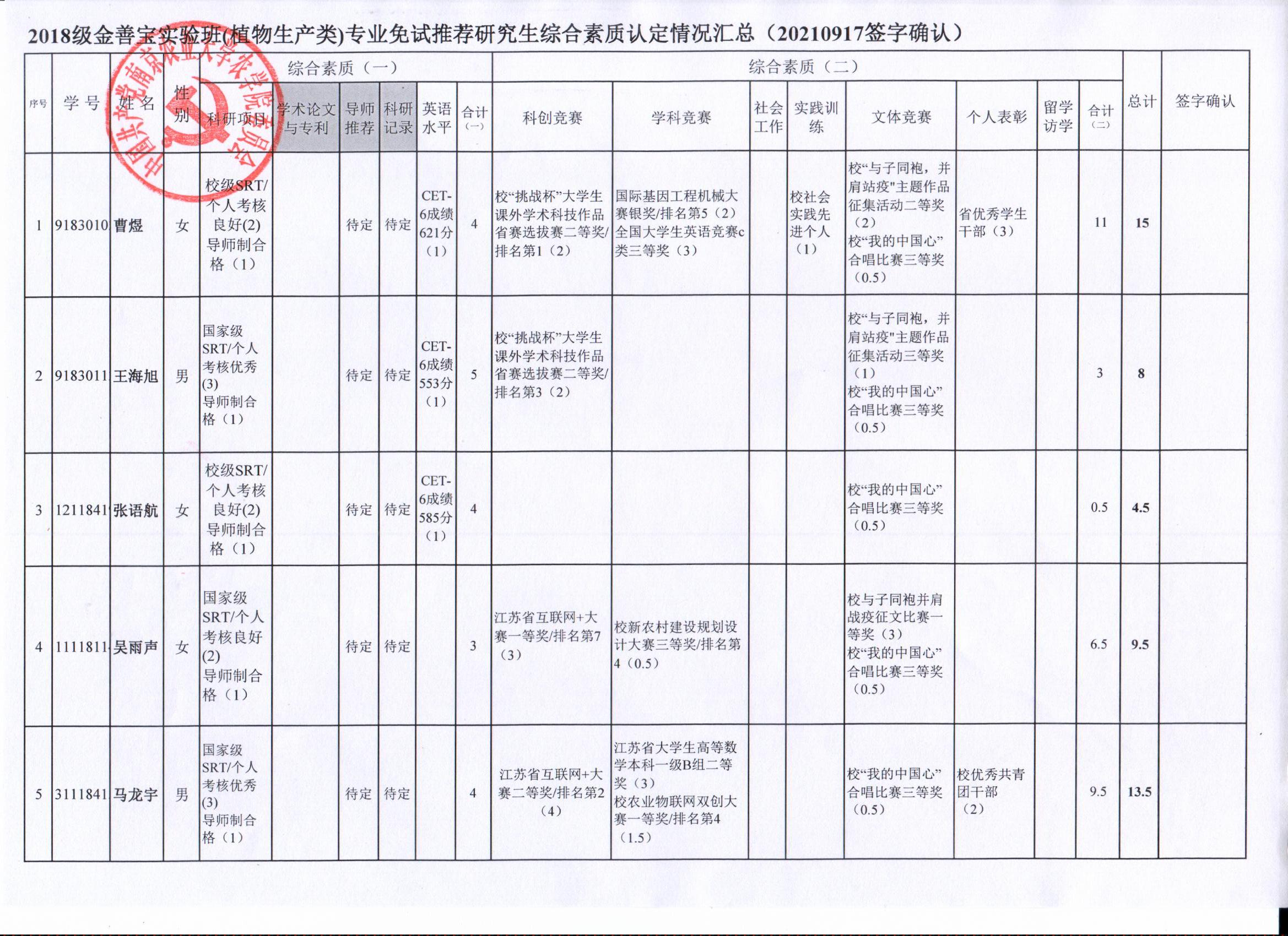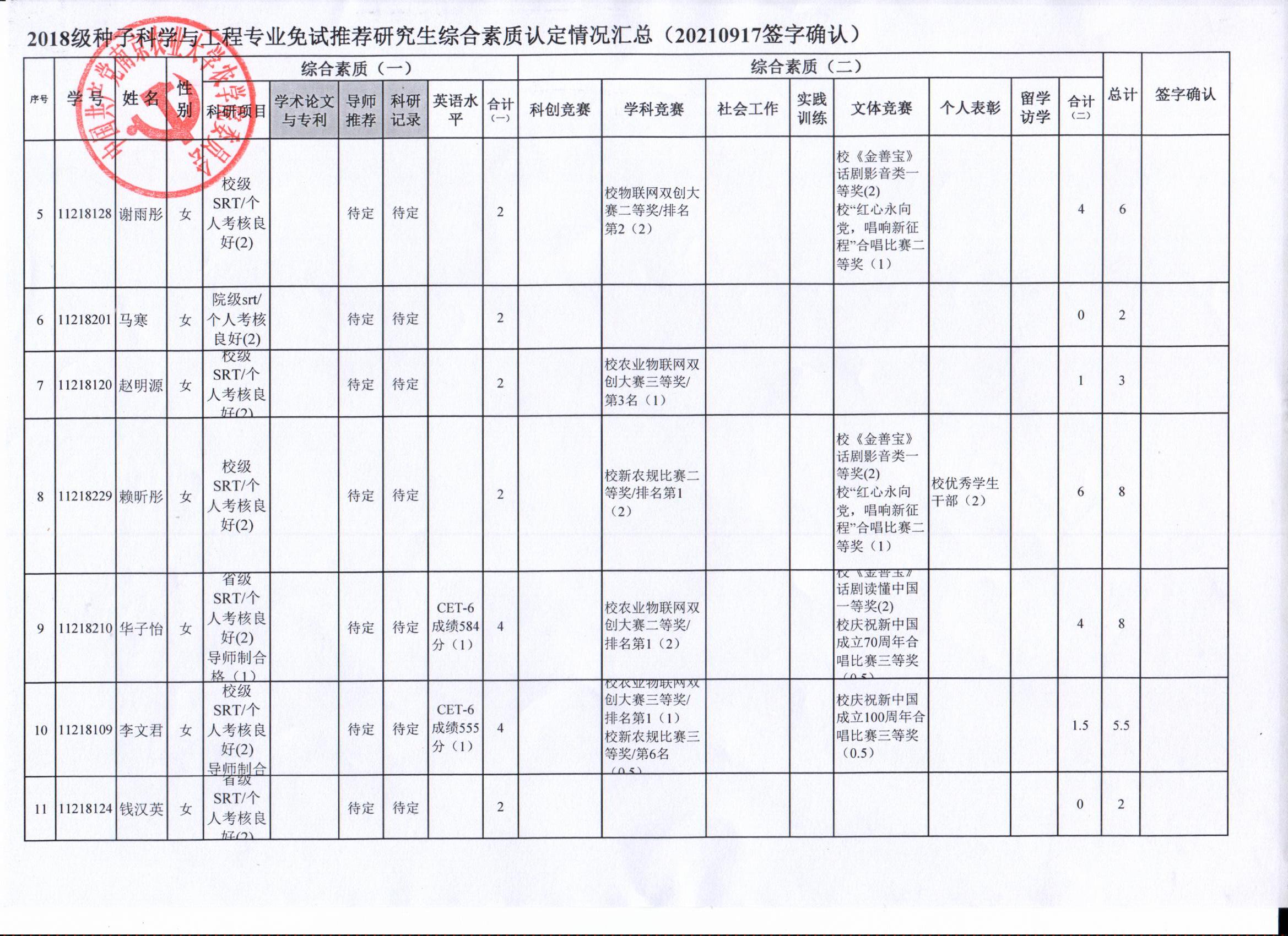 2022年推荐优秀应届本科毕业生免试攻读研究生工作方案》精神,经学生自愿申请、海角社区审核及学生签字确认,综合素质(一)第一、五类与综合素质(二)所有类别得分情况已于9月17-19日进行公示,现予以再次公示。