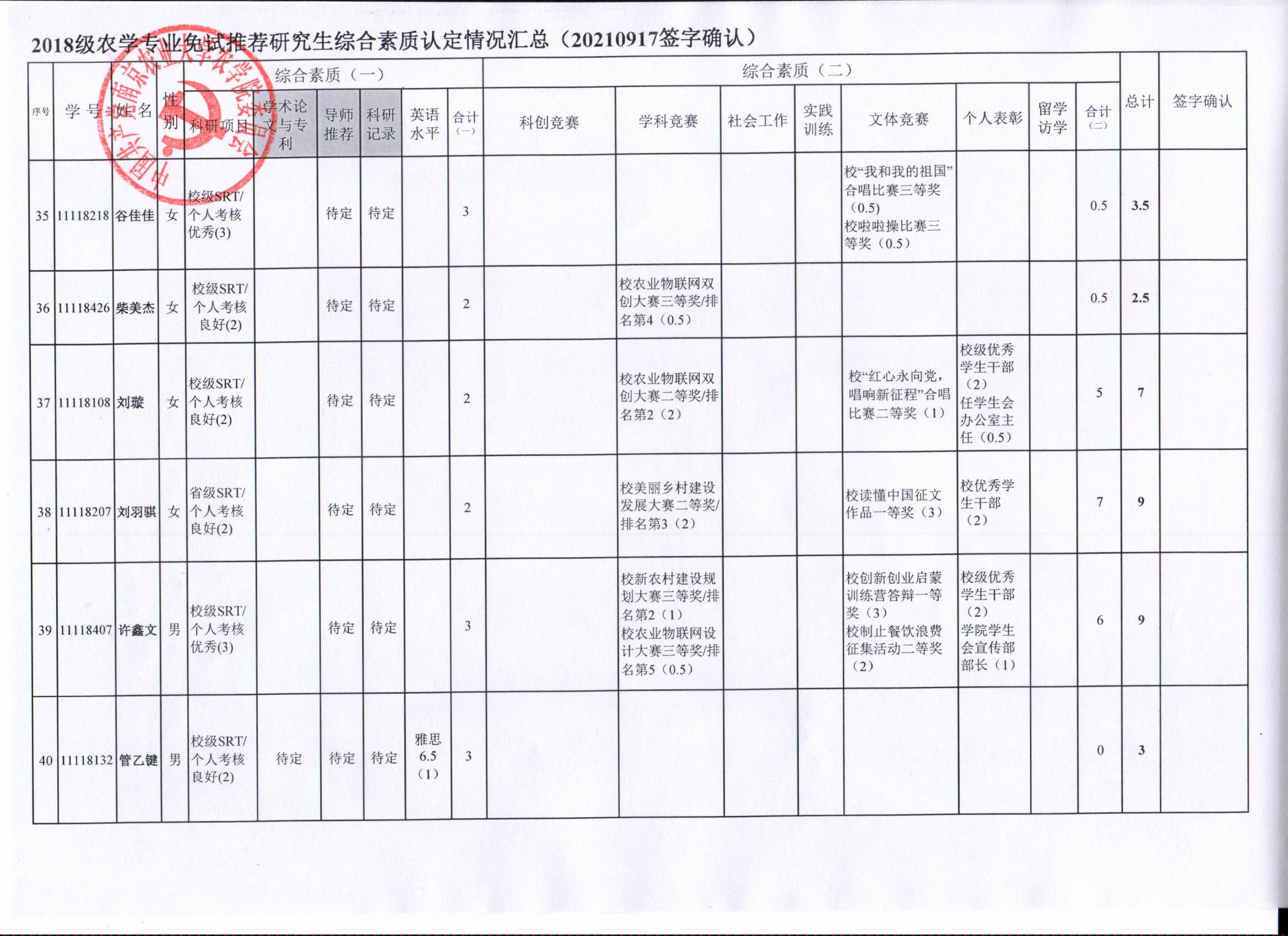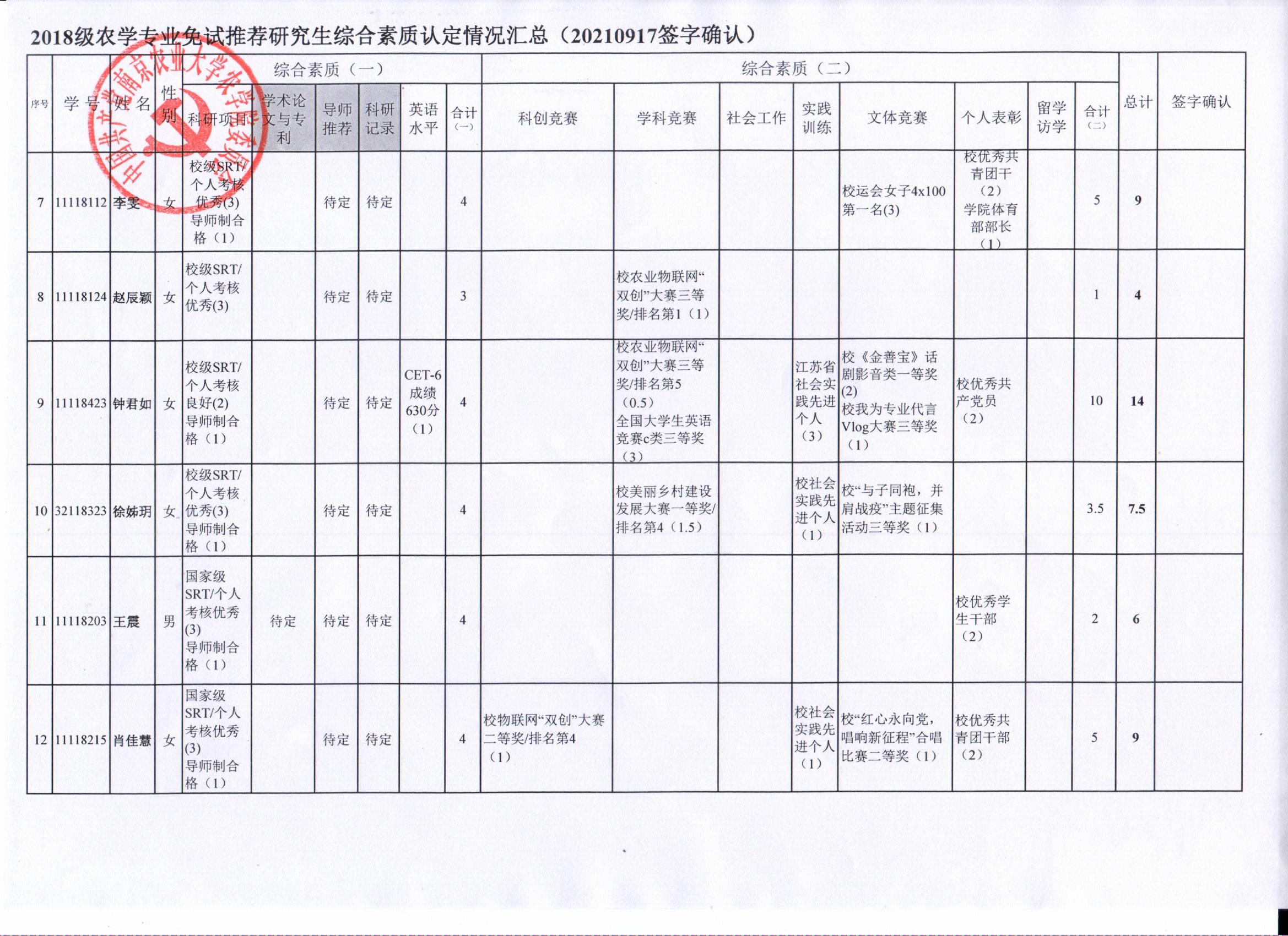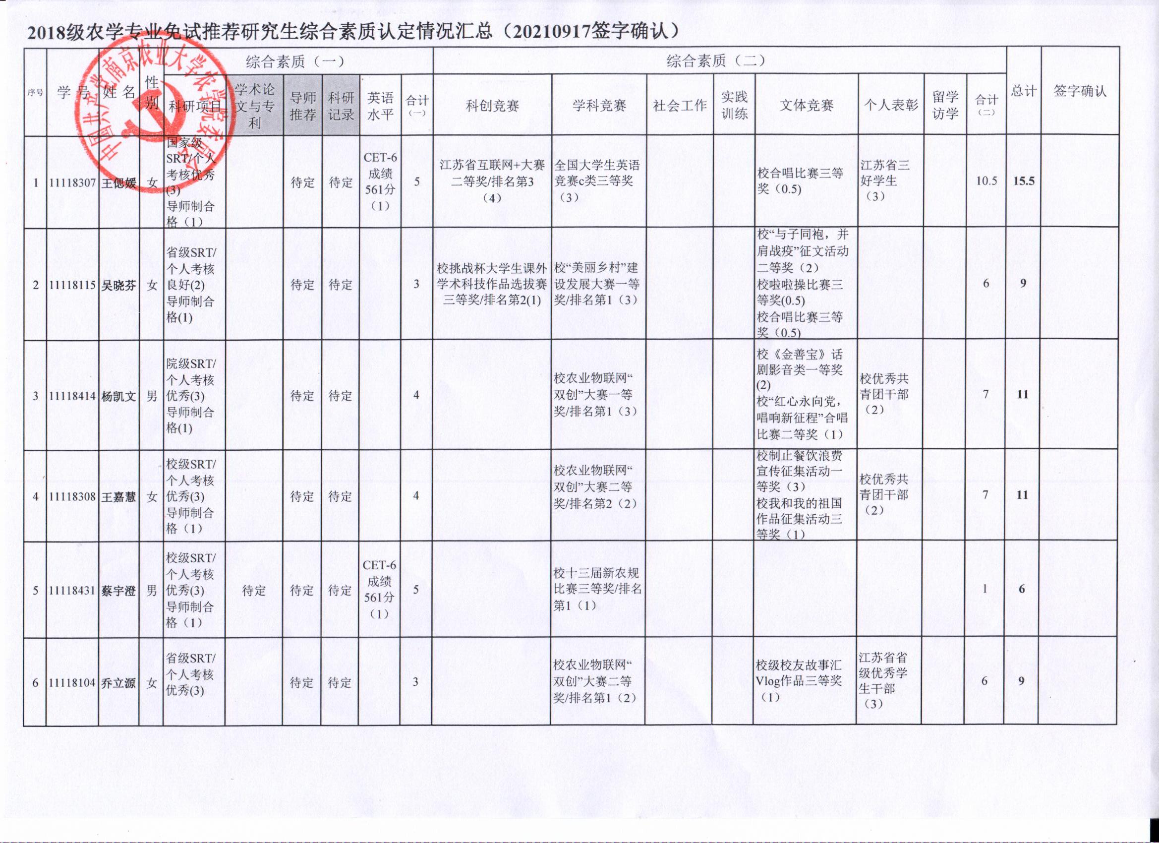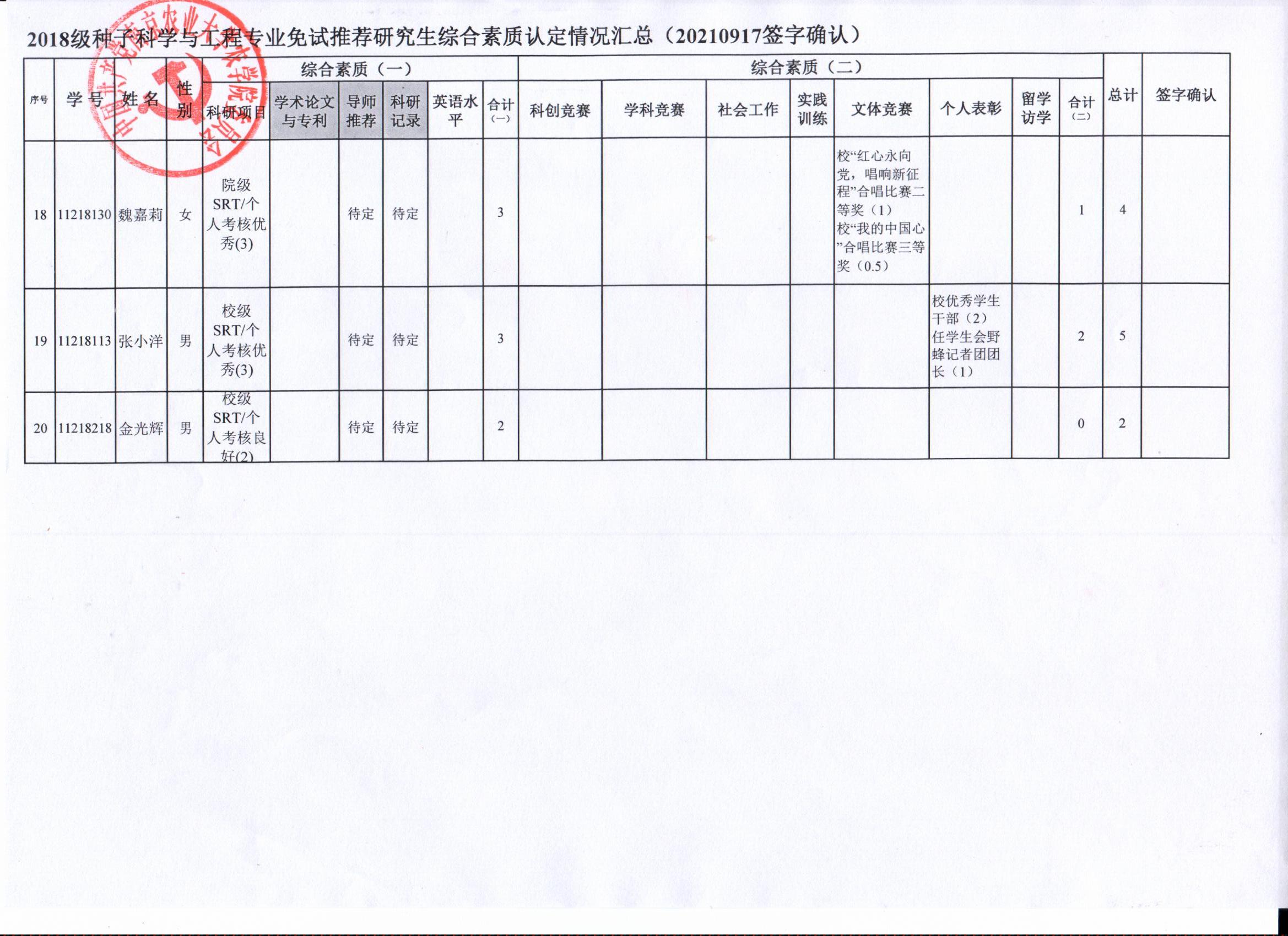 2022年推荐优秀应届本科毕业生免试攻读研究生工作方案》精神,经学生自愿申请、海角社区审核及学生签字确认,综合素质(一)第一、五类与综合素质(二)所有类别得分情况已于9月17-19日进行公示,现予以再次公示。
