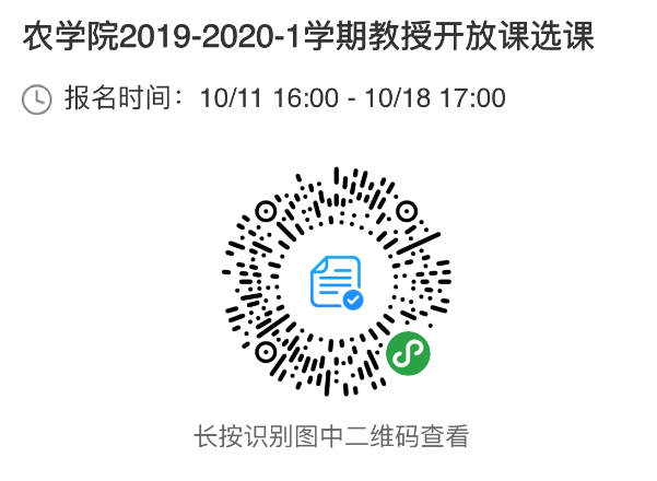 本学期海角社区 “教授开放研究课程”如下表,请有兴趣的同学积极选课,请需要选课的同学在2019年10月18日下午5点前扫描下方二维码,通过微信小程序报名(扫描后进入报名界面,点击“立即报名”即可开始报名)。选课后如想退选,也可在截止日期前通过小程序取消报名。