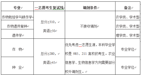 1.第一志愿报考海角社区 作物栽培学与耕作学、作物遗传育种、遗传学3个专业的考生总分在310分以上,英语50分以上(含310分,50分),可以参加所报考专业复试;报考作物和种业2个专业的考生复试分数线总分在280分以上,英语45分以上(含280分,45分),可参加复试,不足部分调剂。